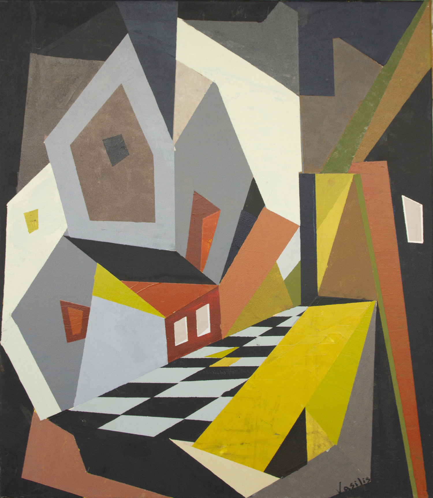 Το έργο «Αρχιτεκτονική Αιχμή» μας εισάγει σε έναν κόσμο όπου η αρχιτεκτονική και η φαντασία συνδιαλέγονται σε μια αυστηρή, αλλά ταυτόχρονα ονειρική γεωμετρική γλώσσα. Η οπτική γωνία μεταβάλλεται συνεχώς, με επίπεδα και σχήματα που μοιάζουν να κινούνται σε διαφορετικούς άξονες, δημιουργώντας μια αίσθηση αστάθειας αλλά και δυναμισμού. Οι έντονες χρωματικές αντιθέσεις —το κίτρινο, το μαύρο, το κόκκινο και οι ουδέτερες γκρι αποχρώσεις— ενισχύουν την ένταση του χώρου, ενώ η σκακιέρα στο προσκήνιο προσφέρει έναν ρυθμικό οδηγό για το βλέμμα. Είναι ένα έργο που προκαλεί τον θεατή να αναζητήσει την ισορροπία ανάμεσα στη σταθερότητα της αρχιτεκτονικής δομής και την ελευθερία της αφηρημένης μορφής.