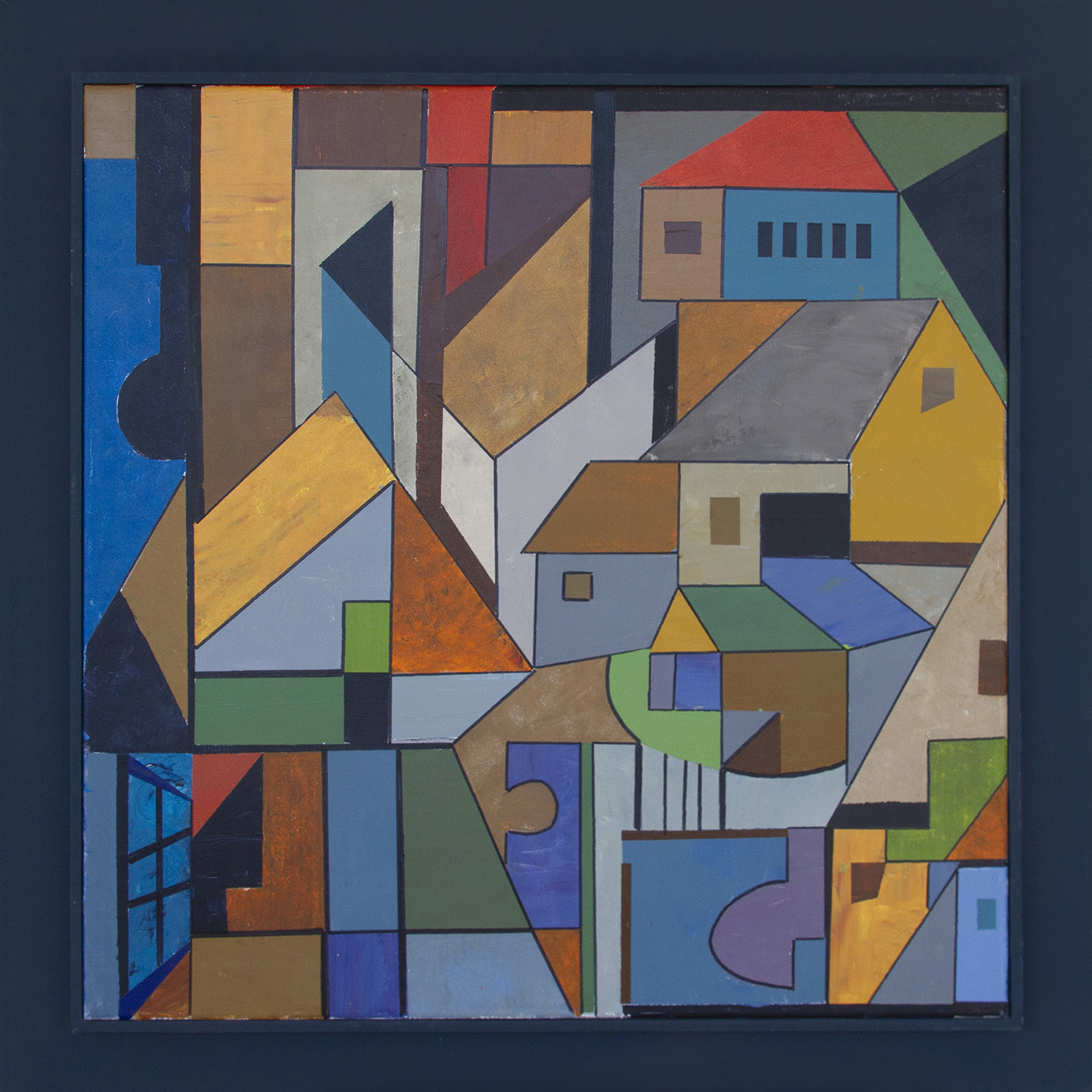 Μια πολύπλοκη και ρυθμική σύνθεση που απεικονίζει έναν φανταστικό οικισμό μέσα από γεωμετρικά σχήματα, κάθετες και οριζόντιες γραμμές, καθώς και διαβαθμίσεις έντονων χρωμάτων. Στοιχεία κτιρίων, παραθύρων και τοίχων συνυπάρχουν σε μια ισορροπημένη αρχιτεκτονική αφαίρεση.