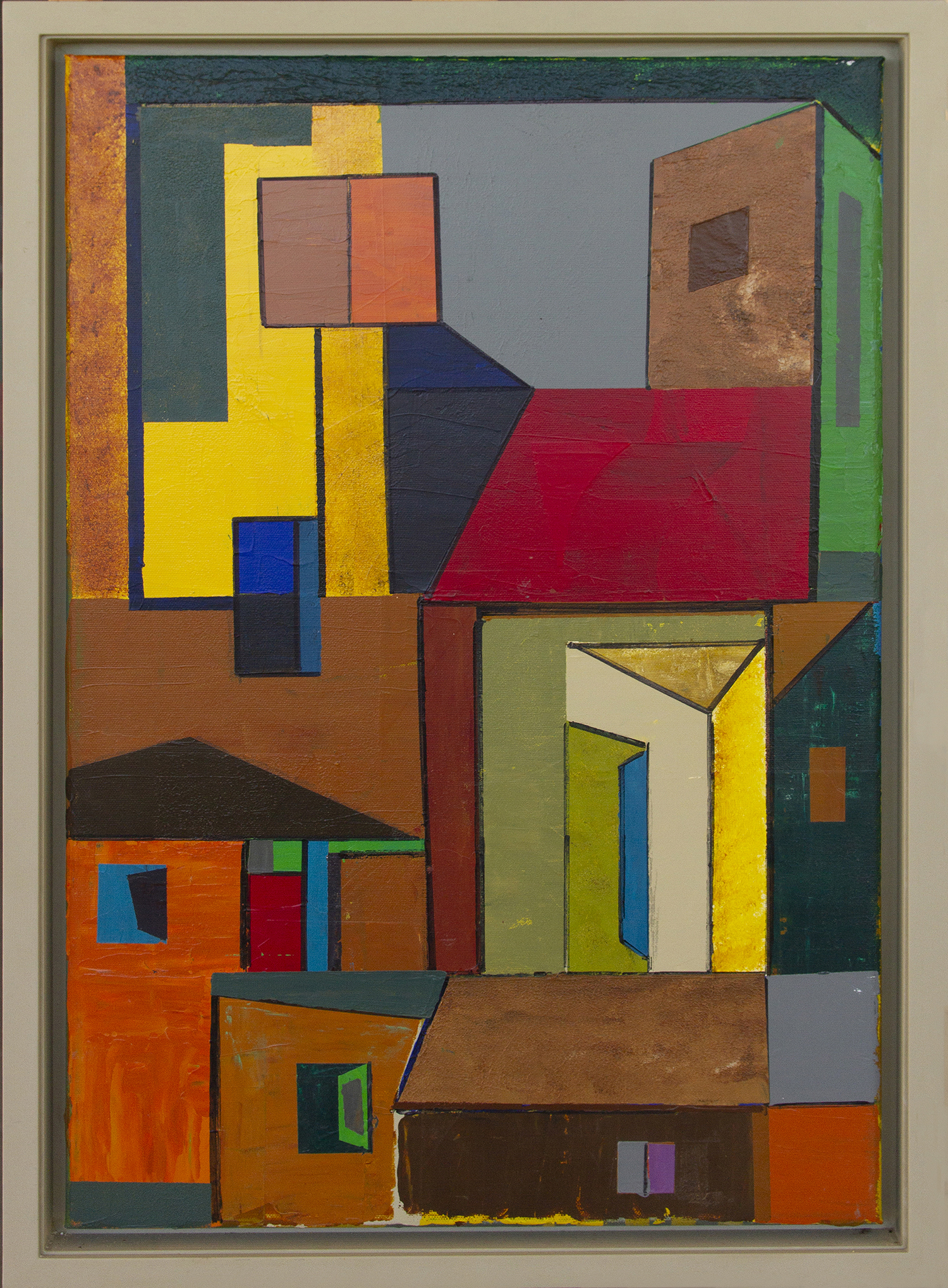 Ο πίνακας αποτυπώνει μια αφαιρετική, γεωμετρική εκδοχή αστικού τοπίου, με διαδοχικές επιφάνειες που παραπέμπουν σε τοίχους, στέγες και ανοίγματα. Η παλέτα είναι ζωηρή, με κυρίαρχες αποχρώσεις κίτρινου, κόκκινου, μπλε, πορτοκαλί και πράσινου, ενώ οι λεπτομέρειες σε μαύρο δημιουργούν σαφή δομή.