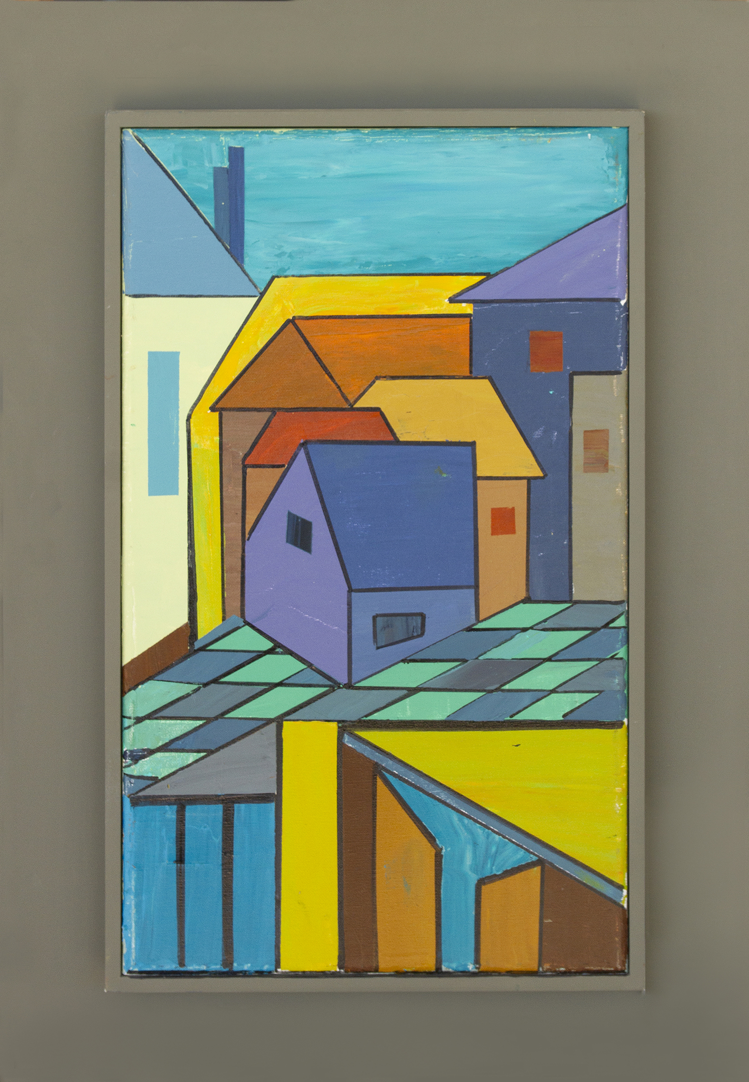 Η σύνθεση αποτυπώνει μια ήσυχη γειτονιά με γεωμετρικές φόρμες και έντονα χρώματα, που θυμίζουν παιδική ζωγραφιά με ακρίβεια και απλότητα. Η πλακόστρωτη αυλή στο προσκήνιο, οργανώνει τον χώρο και οδηγεί το βλέμμα στα φωτεινά σπίτια, δημιουργώντας αίσθηση τάξης και χαράς. Το έργο ταιριάζει ιδανικά σε χώρους που επιθυμούν να προσθέσουν ζωντάνια, καθαρότητα και αρχιτεκτονικό χαρακτήρα.