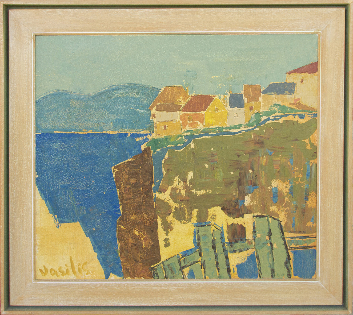 Το έργο αποτυπώνει ένα χωριό χτισμένο στην άκρη του βράχου, με τα σπίτια να φωτίζονται από θερμά χρώματα κίτρινου, ώχρας και κόκκινου, ενώ πίσω τους ανοίγεται η έντονη αντίθεση του μπλε της θάλασσας. Οι όγκοι είναι σχηματοποιημένοι, σχεδόν κυβιστικοί, δίνοντας έμφαση στη γεωμετρία και τη δομή του τοπίου. Η ζωγραφική επιφάνεια παραμένει ζωντανή και πλούσια, με έντονες πινελιές και χρωματικές αντιθέσεις που δημιουργούν αίσθηση φωτεινότητας και καθαρότητας, χαρακτηριστική του ελληνικού καλοκαιρινού τοπίου.